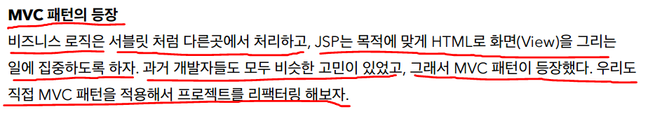 한곳에서 모든것을 다하면 문제가 발생하니까 서블릿을 비즈니스로직을 처리하는 부분으로 , JSP를 최대한 html로 화면(뷰)를 그리는 부분으로 사용하게끔하여 서블릿과 jsp로 mvc패턴을 적용해보자.