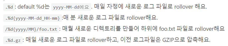 <!--%d{yyyy-MM-dd}로 rollover되는 시간을 매일 자정으로 설정했고, 로그파일이 logs/backup/warn 폴더에 gz압축파일형식으로 저장된다.-->