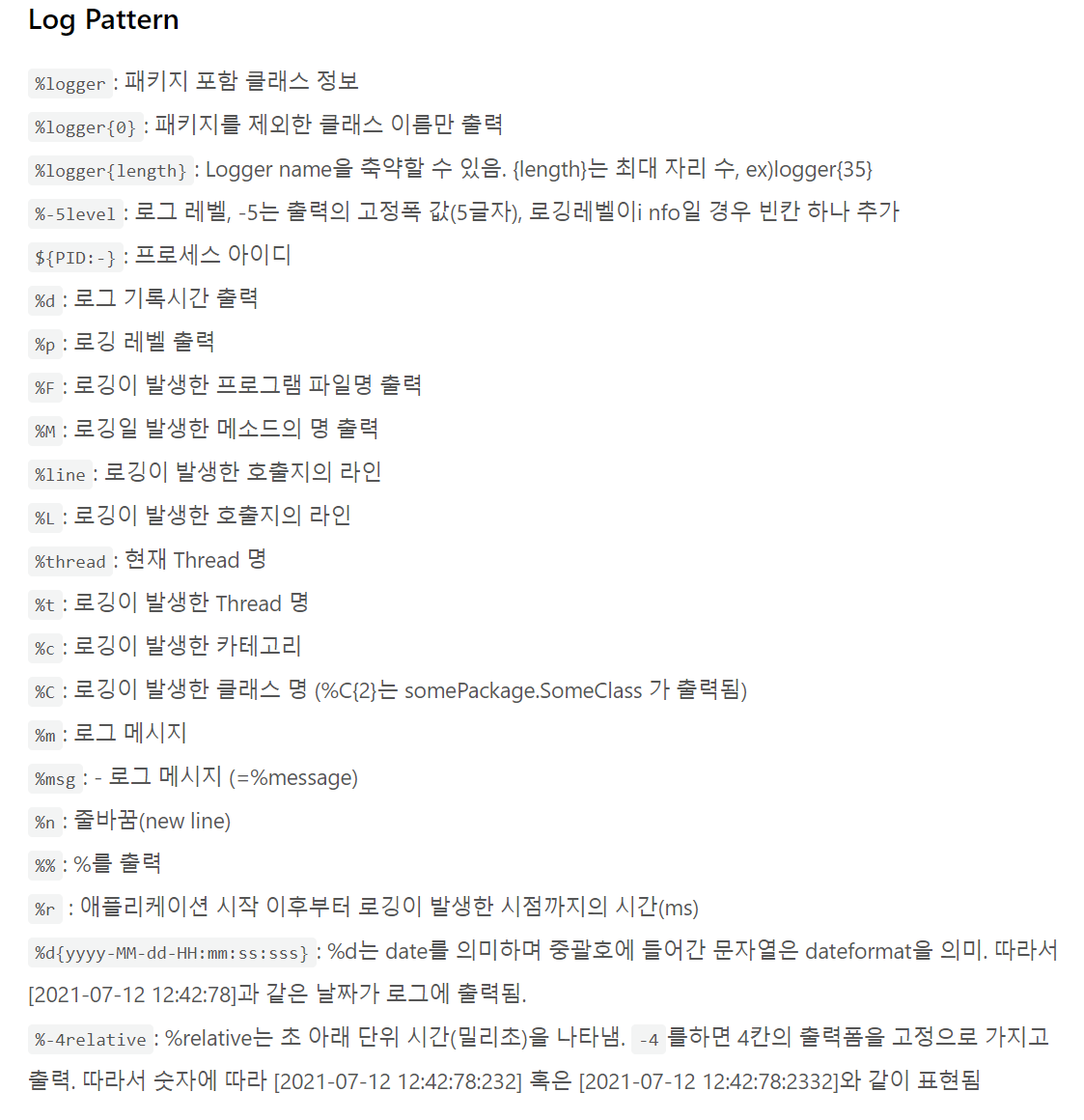 로그 패턴을 저장한 변수 , %d{}는 로그 기록시간 관련, %-4relatevie는 밀리세컨드를 최대 4칸까지 출력, %green([%thread])는 현재 쓰레드이름을 초록으로 출력,