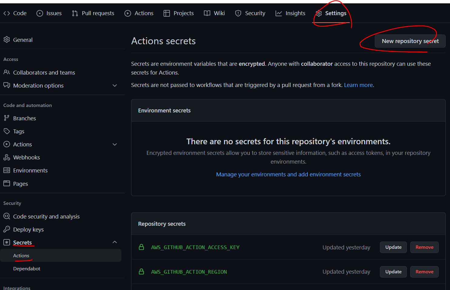 레포지토리에서 setting -> secrets -> actions에서 저장소의 비밀값들을 저장할 수 있다.