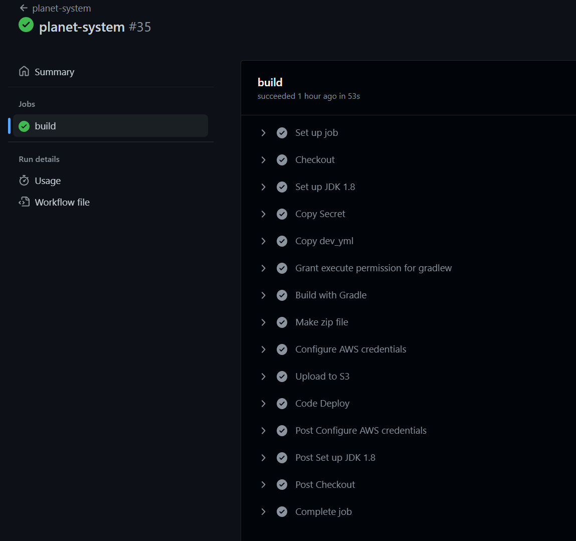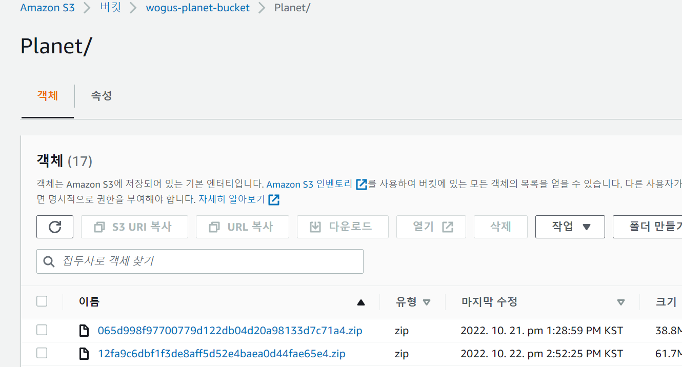프로젝트이름의 폴더명안에 zip파일이 있는걸 확인할 수 있다! (빌드된 jar파일이 압축되서 업로드된 결과)!