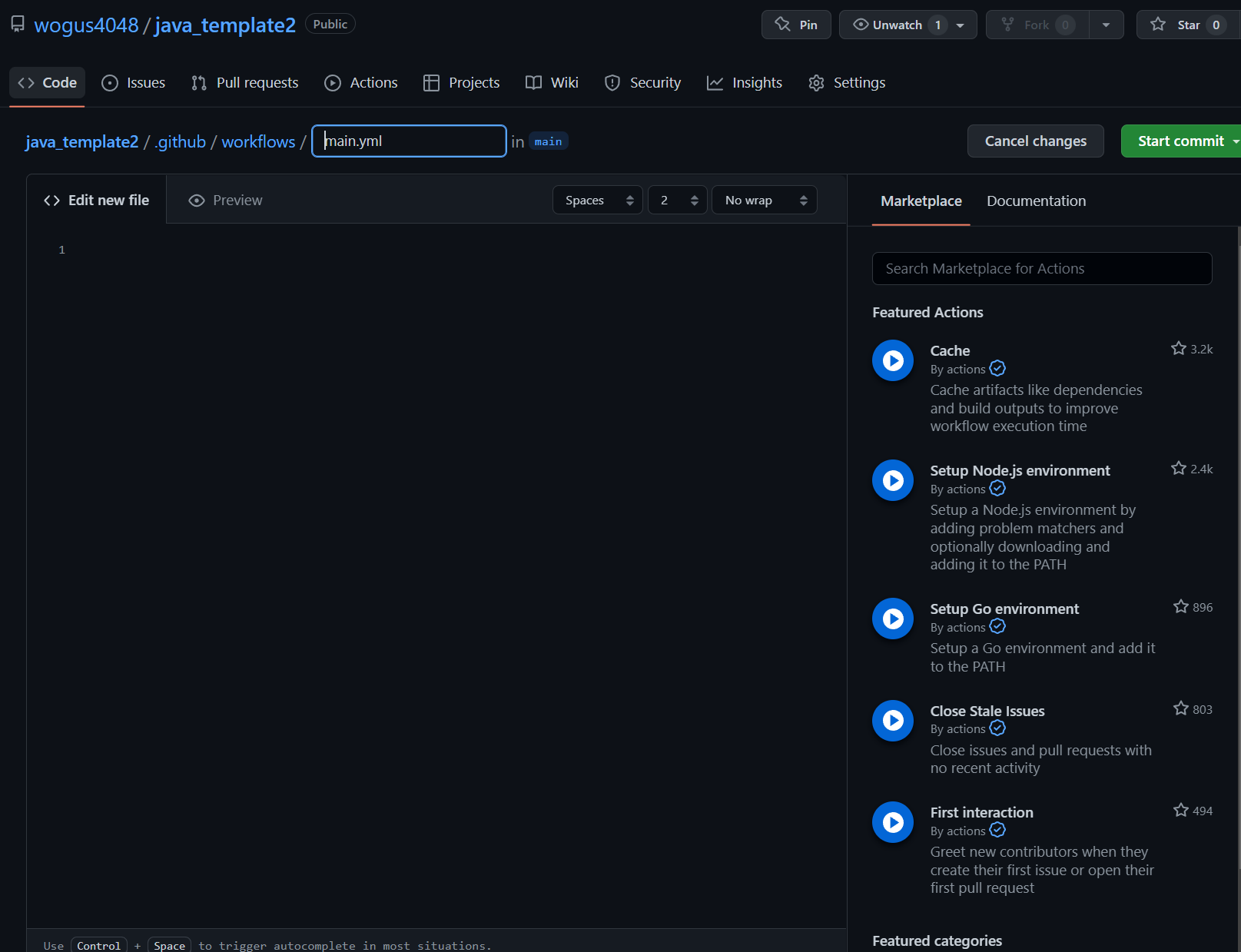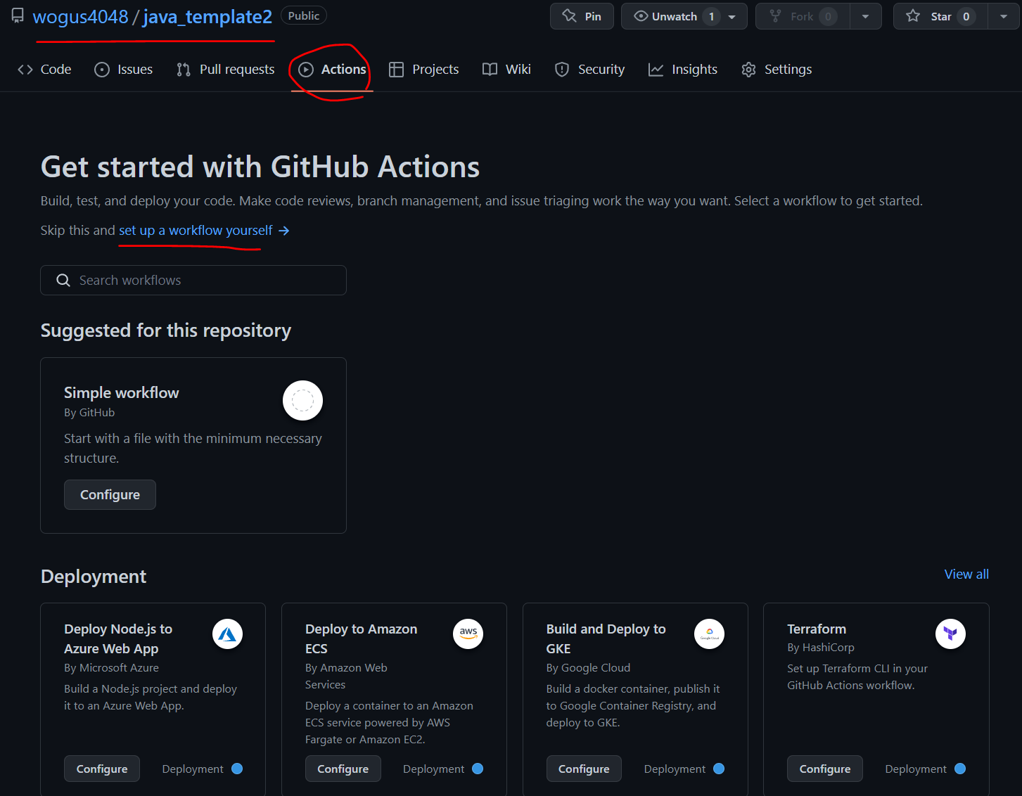set up a workflow yourself 를 누르면 나만의 워크플로우를 만들 수 있다 ( 자동으로 빌드/테스트 + 배포 명령 전달 를 할때 어떤식으로 진행될지 진행순서를 작성하는곳이라고 생각하면될듯)