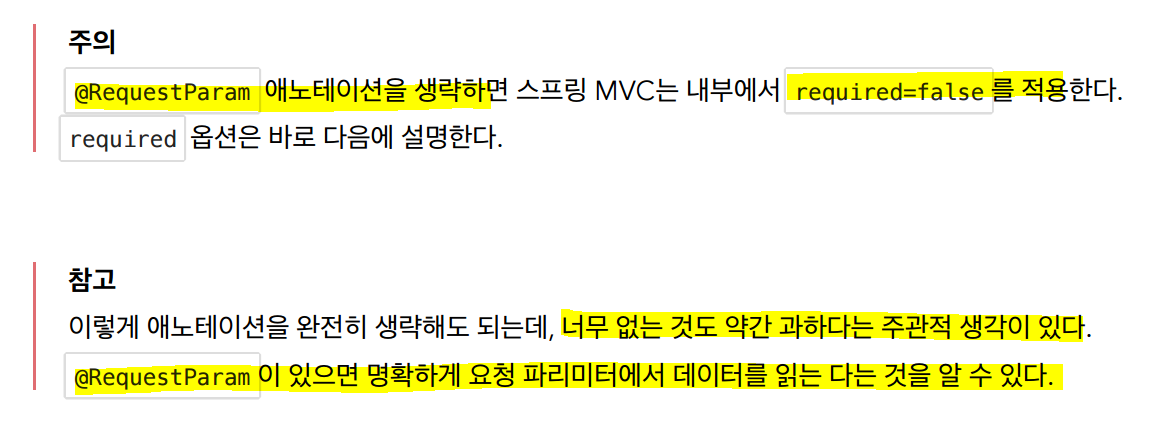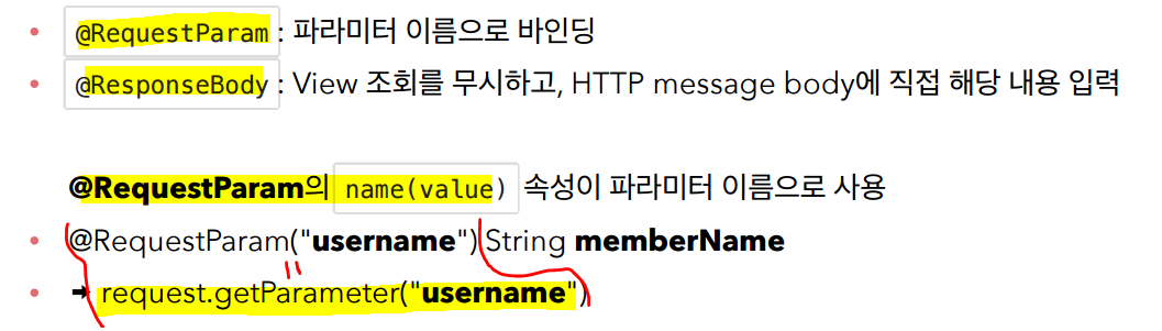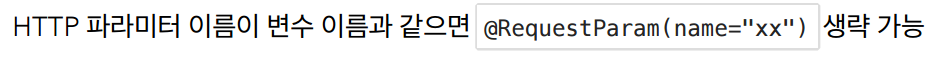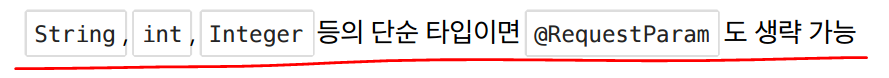 @RequestParam String username, //파라미터명과 변수명이 같을때, 파라미터명이 생략가능하다.