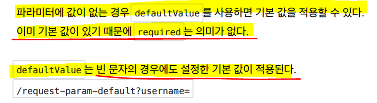 @RequestParam(required = true,defaultValue = "guest") String username, //반드시 넣어야하는값으로 설정되어있는경우(기본값), 안들어왔을경우를 대비하여 defaultvalue설정