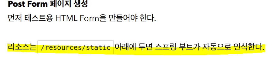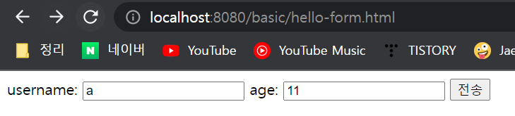서버주소 + html 위치를 적으면 잘 보인다. ( 실제경로는 프로젝트/resources/static/basic/hello-form.html이지만 리소스 기본경로는 /resources/static이므로 생략이 가능)