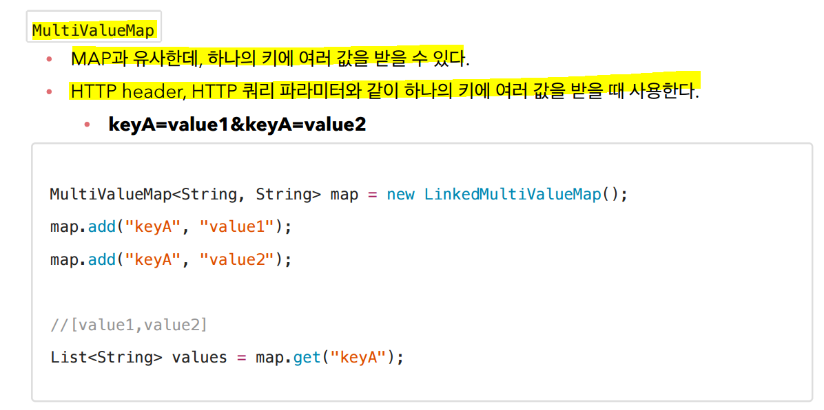 그렇지않고 하나의 파라미터명에 2개이상의 파라미터값이 들어올 수 있다면 MultiValueMap을 사용한다.