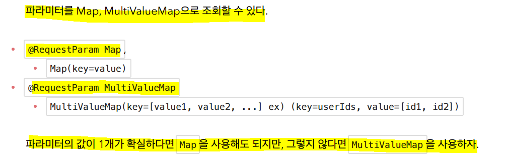 @RequestParam Map<String,Object> paramMap) // 모든 요청 파라미터를 Map으로 받을 수 있다. String에는 파라미터명, Object에는 파라미터값을 저장