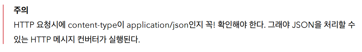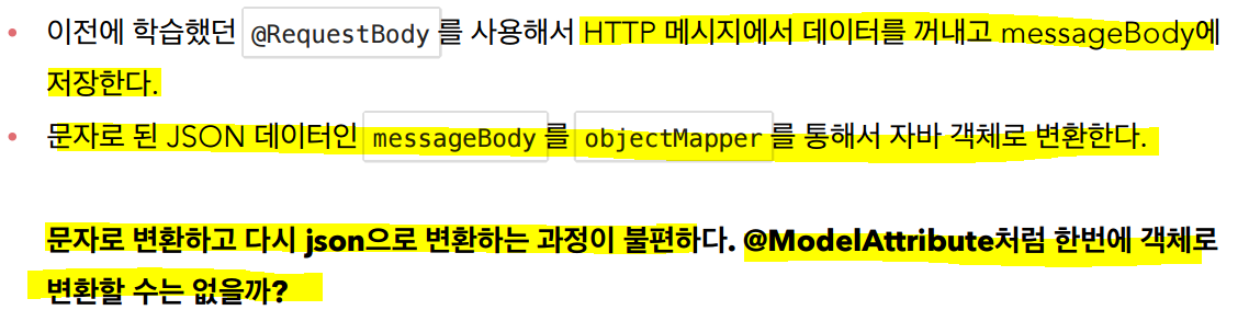 JSON데이터가 들어왔고 @RequestBody를 이용해 객체로 변환받을때 http메시지컨버터가 JSON을 객체로 변환해주고