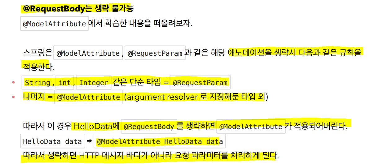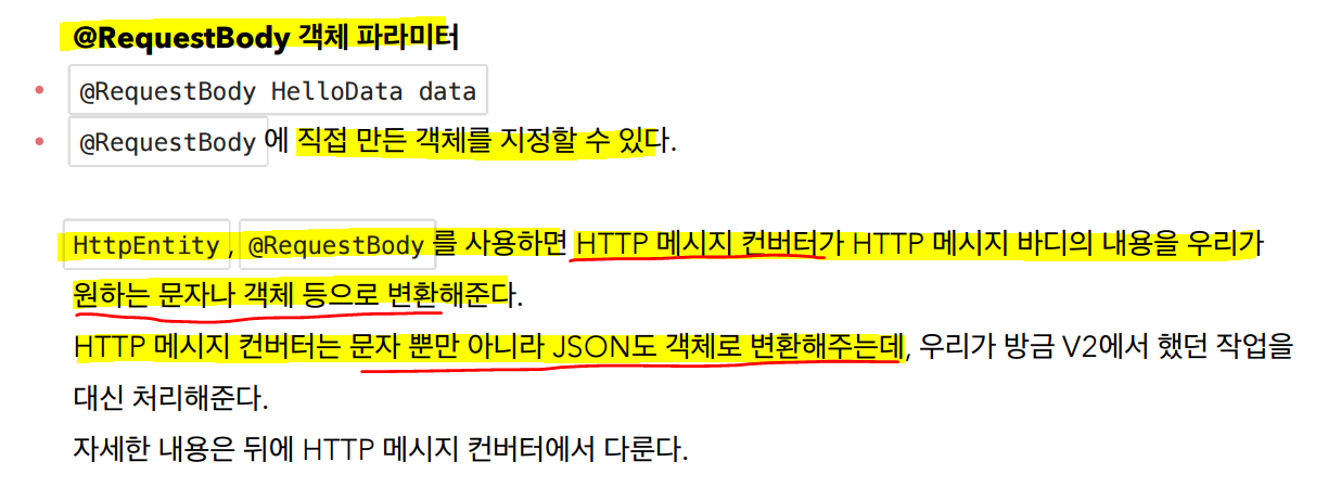 객체를 파라미터로 넘길 수 있다. ( ex) @RequestBody HelloData helloData