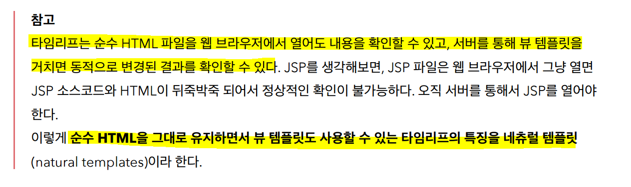 그래서 타임리프가 natural 템플릿엔진인것이다. 서버를 사용하지않을떄는 html파일 그대로를 깨뜨리지않고 실행시켜주고 서버를 이용할때는 타임리프를 통해 렌더링되어 동적으로 페이지를 보여주게끔하는 장점이다!