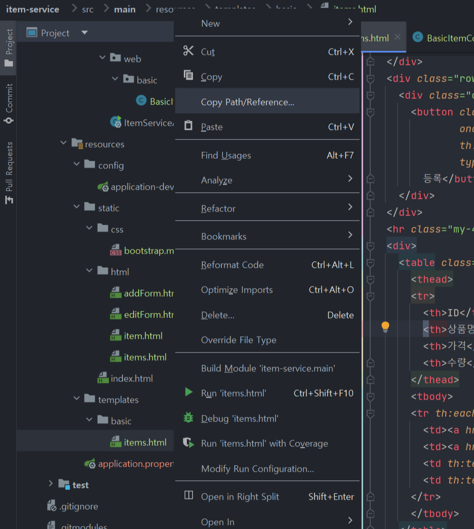 static/html/item.html를 templates/basic/로 복사 한후 타임리프 템플릿으로 수정해보자.