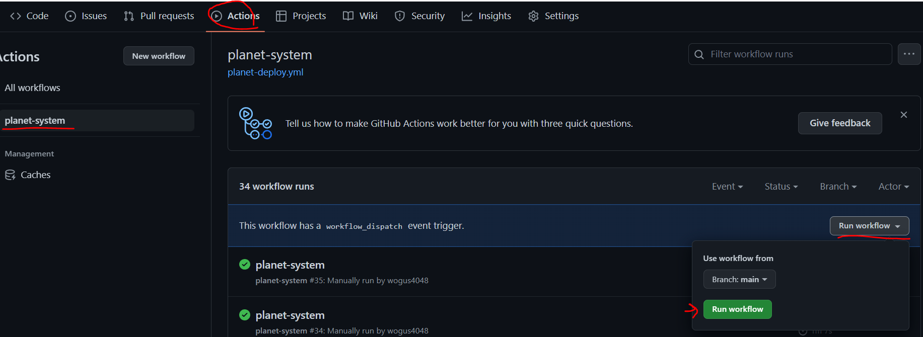 원격저장소 -> Actions -> run workflow 실행