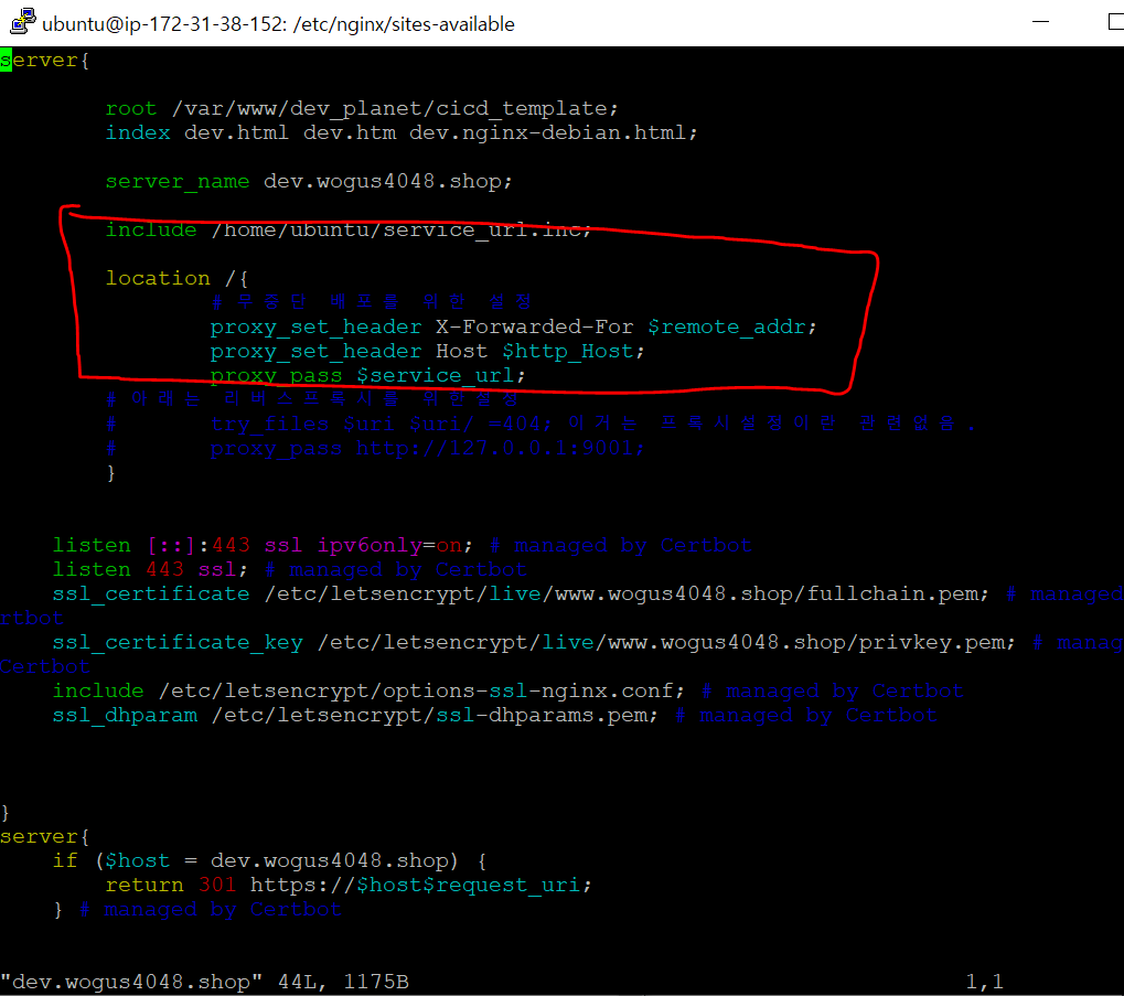 나같은 경우는 dev.wogus4048.shop이라는 서브도메인.conf 파일을 생성해줬으므로 거기서 설정해준다.