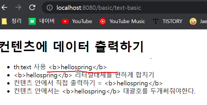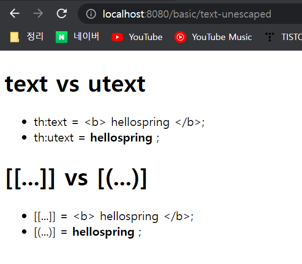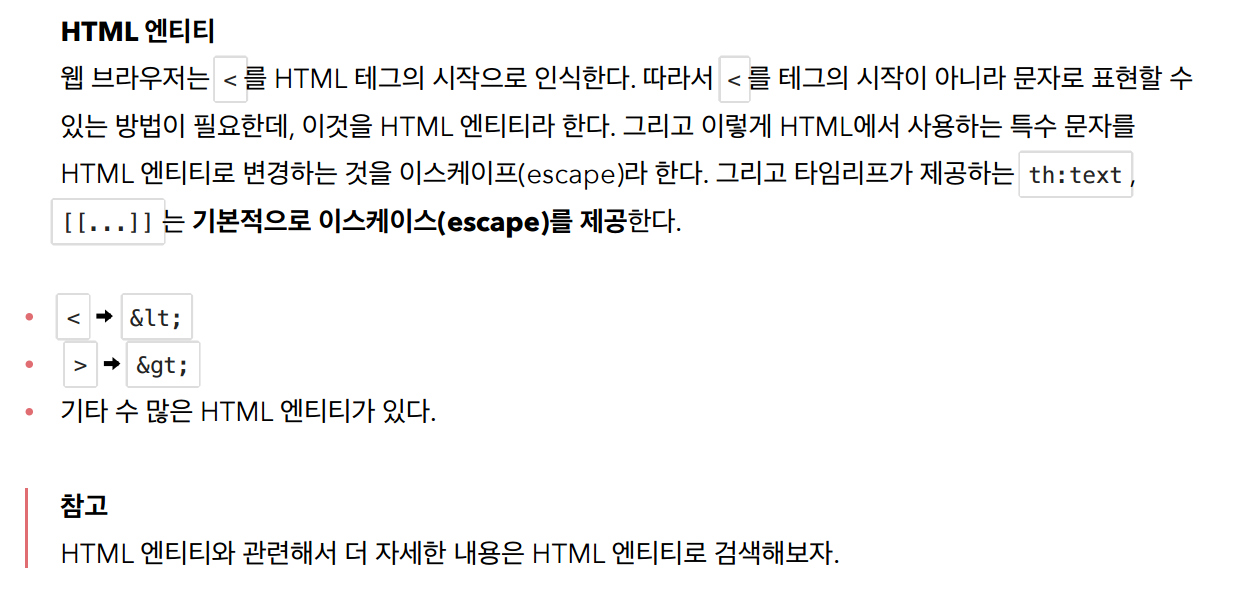 타임리프가 <b>같은 태그형식을 보면 그냥 출력하지않고, HTML 엔티티라는것으로 바꿔서 출력해준다.