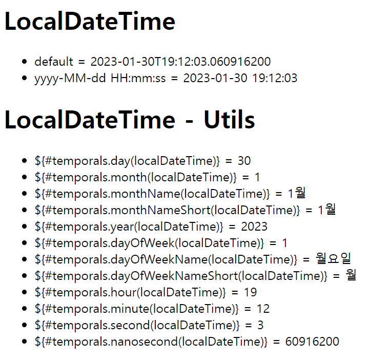 <li>${#temporals.day(localDateTime)} = <span th:text="${#temporals.day(localDateTime)}"></span></li>