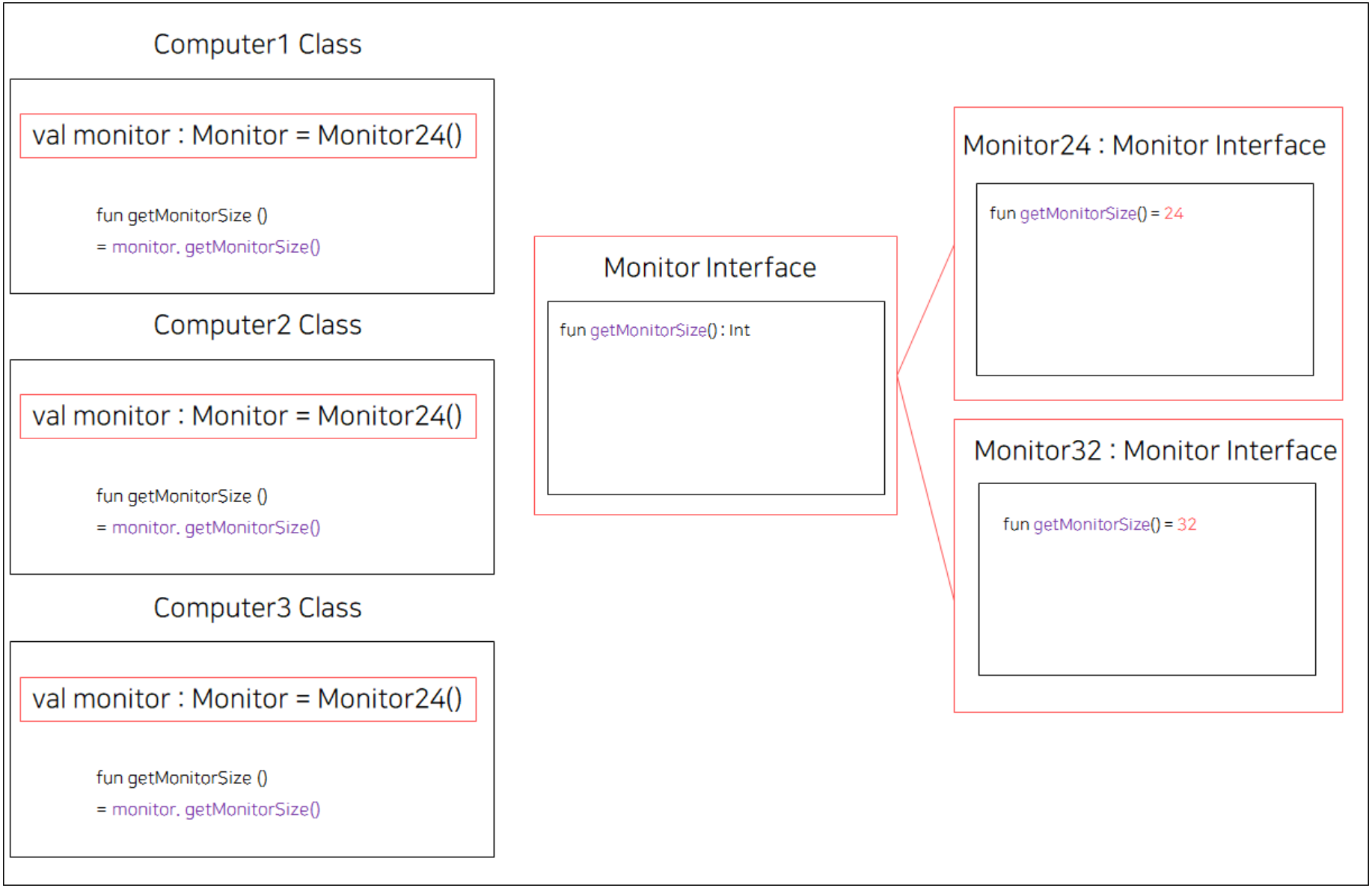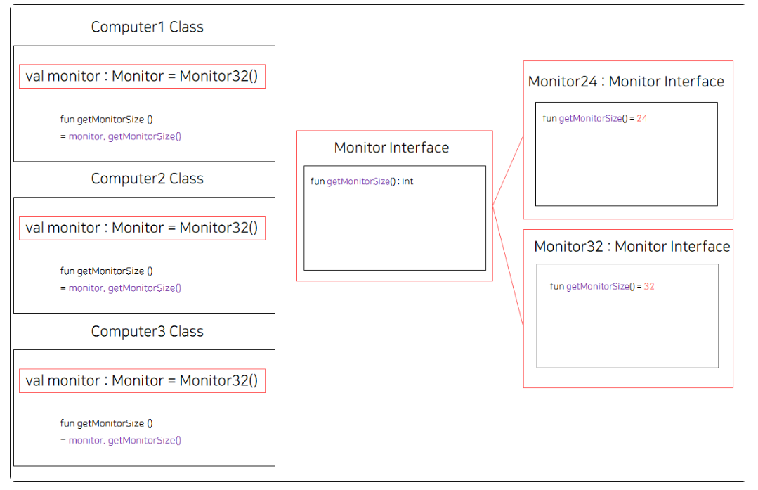 하지만 모니터를 32인치로 바꾸려고 하면 컴퓨터1,2,3 클래스의 모니터 객체 생성코드를 각각 바꿔줘야한다.