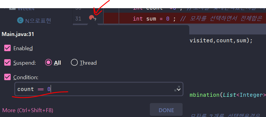 해당 조건에서만 브레이크포인트에 멈춘다는뜻, 반복문 같은 경우 어떤값이 입력됬을때를 확인하고싶다면 사용한다.
