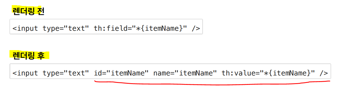 field가 있으므로 id,name,value 속성이 자동으로 처리될것인데 id와 name은 th:field에 적은 필드명(itemName)이고