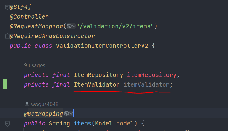 1. 스프링빈으로 등록되어있는 ItemValidator를 의존관계 주입한다. (생성자 주입)
