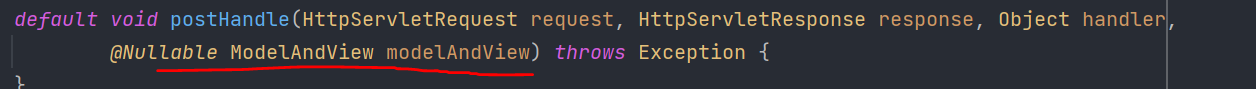 default void postHandle(HttpServletRequest request, HttpServletResponse response, Object handler, @Nullable ModelAndView modelAndView) throws Exception {