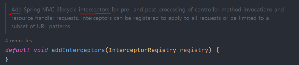 //HandlerInterceptor안의 메소드들은 다 default로 되어있어서 직접 오버라이드 해준다.