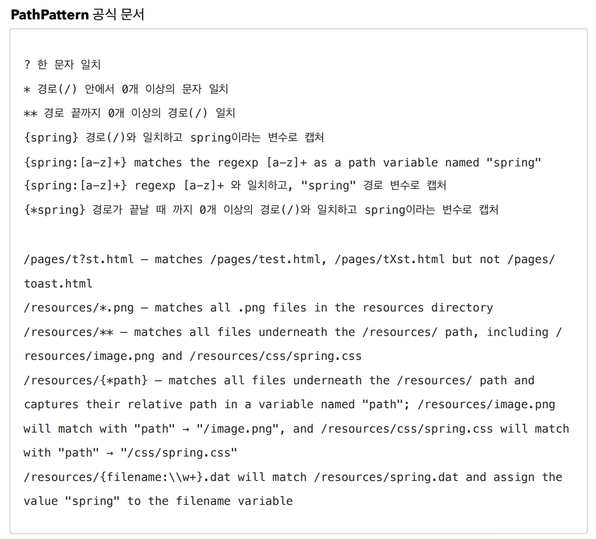 스프링 인터셉터에도 URL 패턴을 적용할 수 있는데, 서블릿 URL 패턴과는 다르고, 매우 정밀하게 설정할 수 있다.