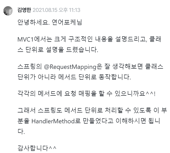 // @Controller, @RequestMapping을 사용해서 핸들러매핑을 RequestMappingHandlerMapping로 사용하게 되면 이 경우에는 핸들러 정보로 HandlerMethod가 넘어온다.
