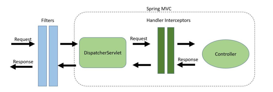 스프링 인터셉터는 디스패처 서블릿과 컨트롤러 사이에서 컨트롤러 호출 직전에 호출 된다.