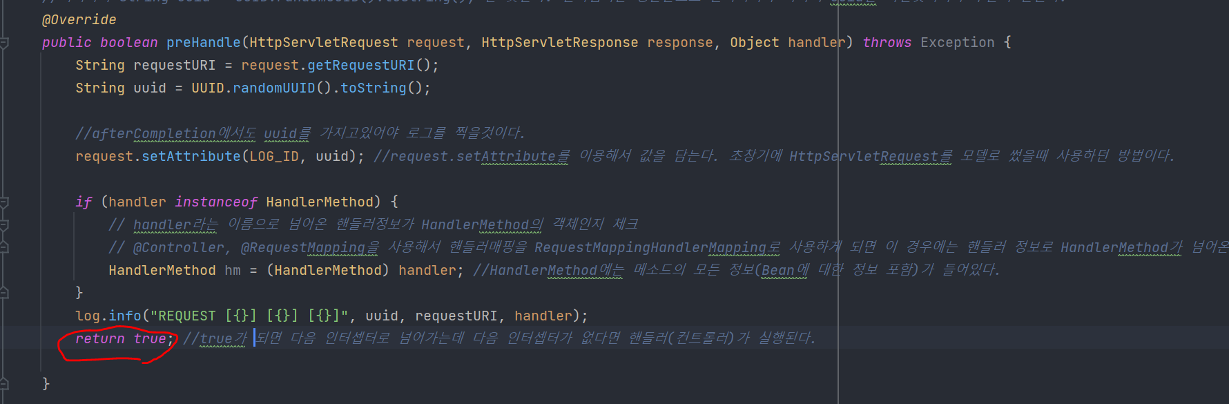 true 면 정상 호출이다. 다음 인터셉터나 컨트롤러가 호출된다