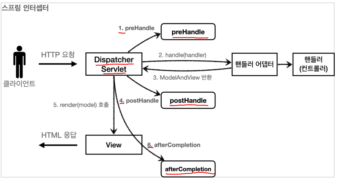 인터셉터는 컨트롤러 호출 전( preHandle ), 호출 후( postHandle ), 요청 완료 이후( afterCompletion )와 같이