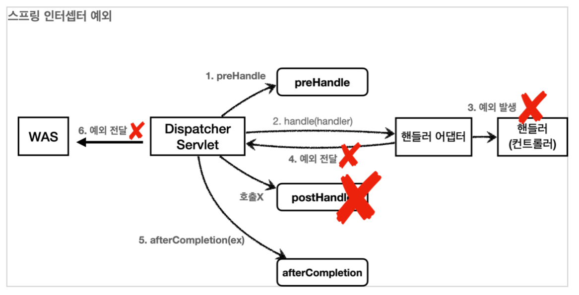 예외가 발생하면 afterCompletion() 에 예외 정보( ex )를 포함해서 호출된다.