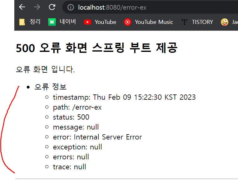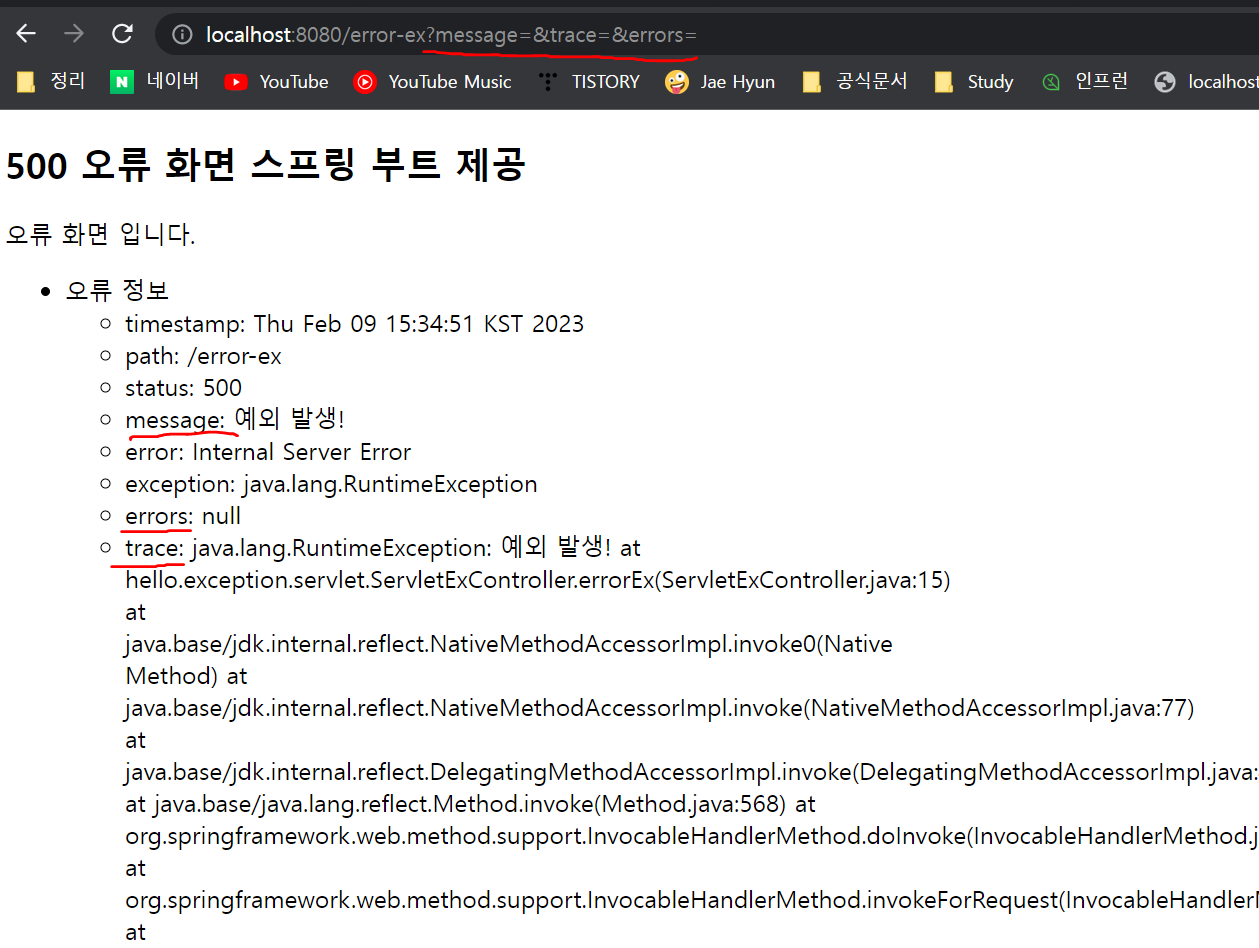 BasicErrorController가 제외한 오류 정보 model에 포함하게 설정하기