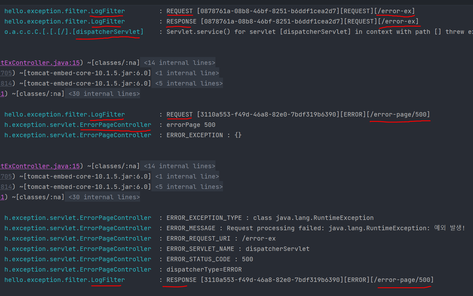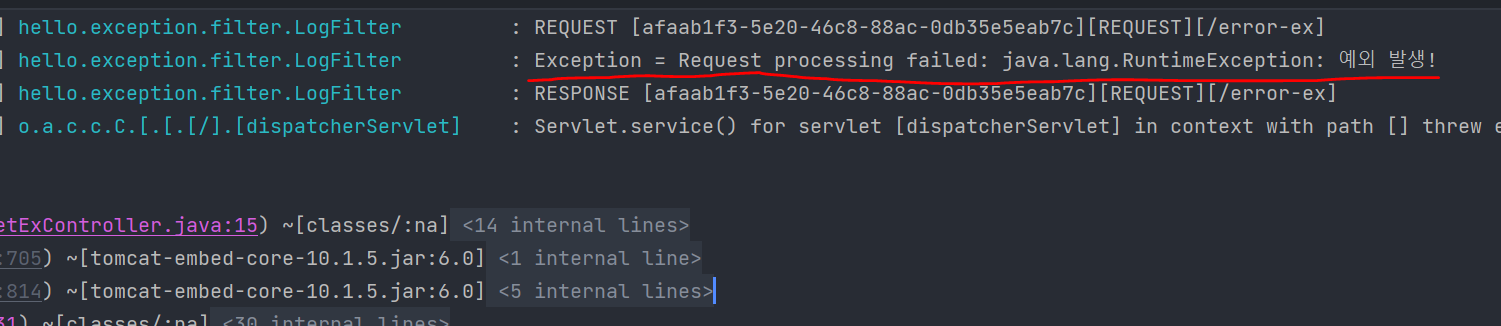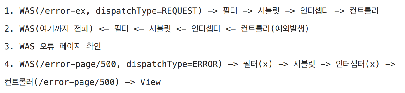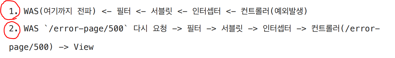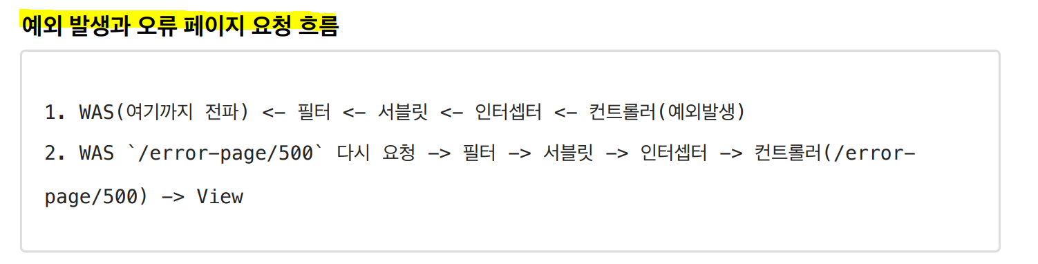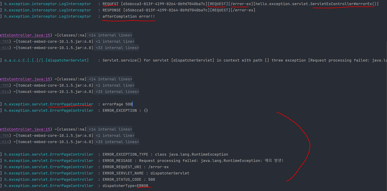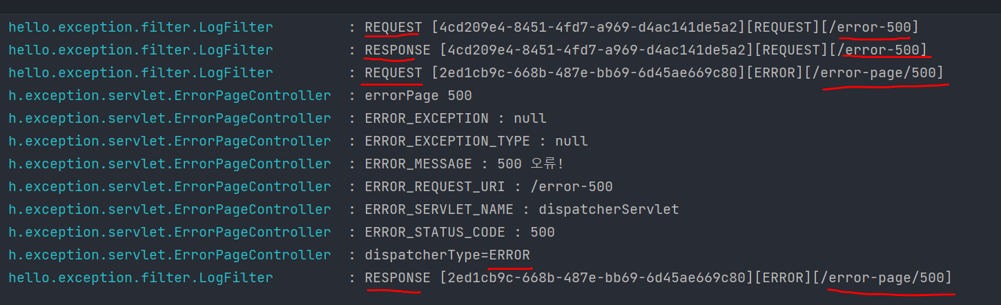 예외페이지로 이동하는 호출에서 필터,인터셉터가 중복 실행 안되게끔 하는방법은 서블릿에서 적용했던것과 일치한다.