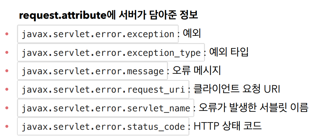 오류(에러)가 발생했을 때 HttpServletResponse가 제공하는 sendError라는 메서드를 사용해도 된다.