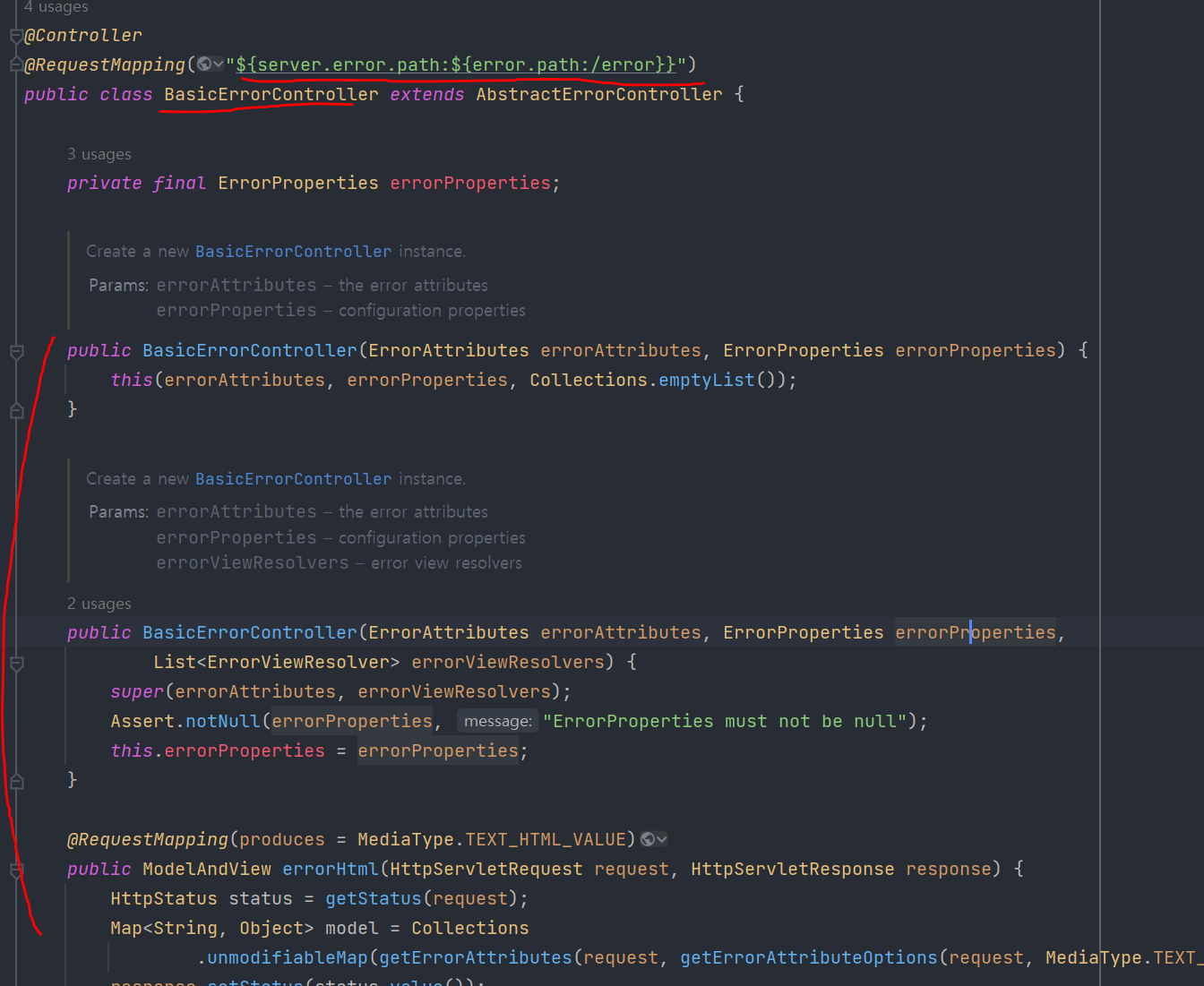 그래서 BasicErrorController 오류 컨트롤러에서 다음 오류 정보를 model 에 포함할지 여부 선택할 수 있다.