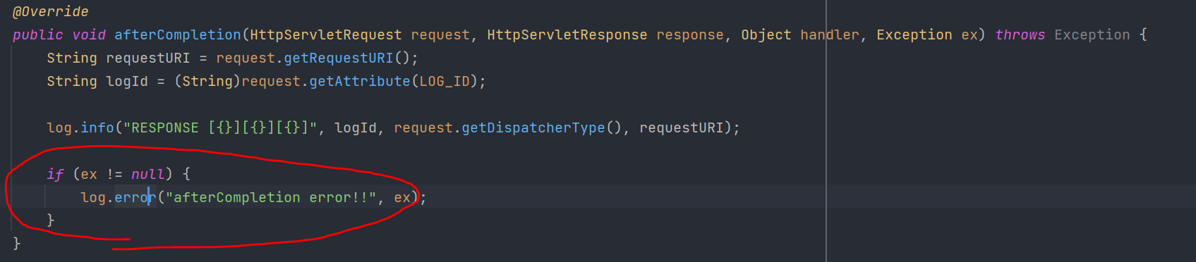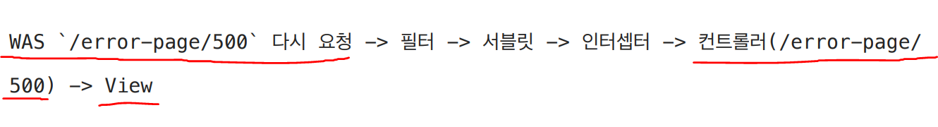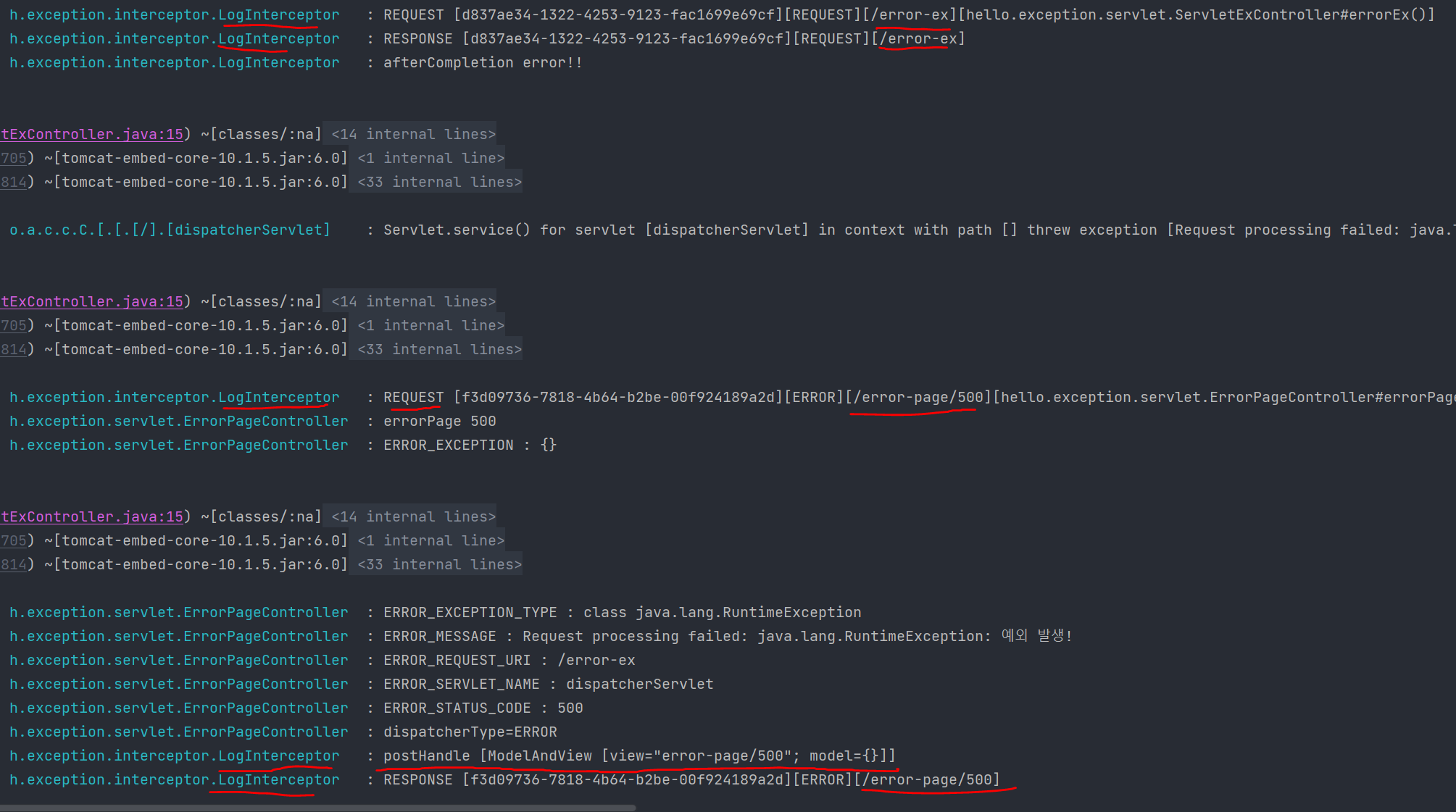 인터셉터는 스프링부트의 기본 에러 페이지 경로인 /error에 대한 인터셉터 적용예외처리해주면된다.
