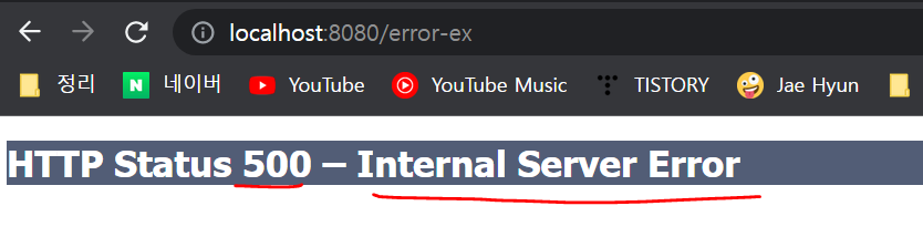 Exception의 경우 서버 내부에서 처리할 수 없는 오류가 발생한 것으로 생각해서 HTTP 상태 코드 500을 반환한다.