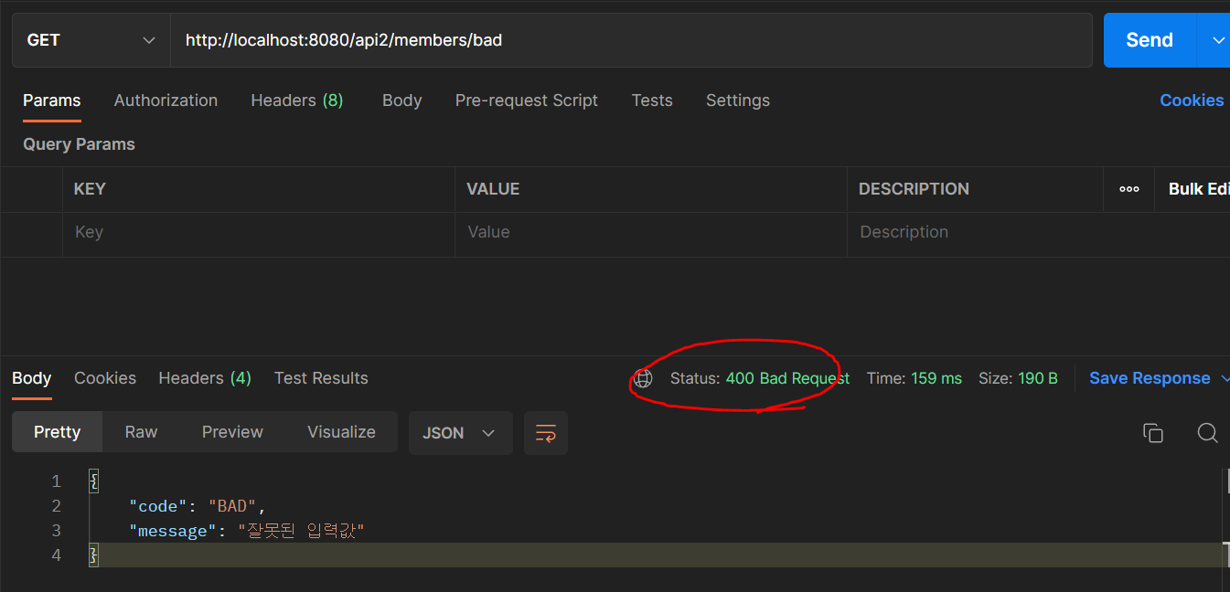 return new ResponseEntity<>(errorResult, HttpStatus.BAD_REQUEST); //ResponseEntity를 이용하면 상태코드도 지정가능
