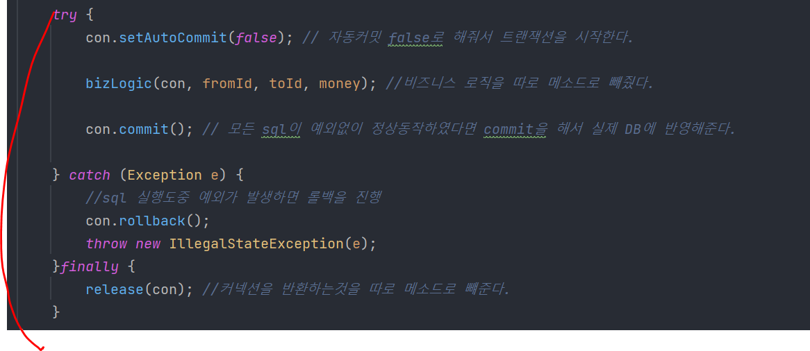 bizLogic(con, fromId, toId, money); //비즈니스 로직을 따로 메소드로 빼줬다.