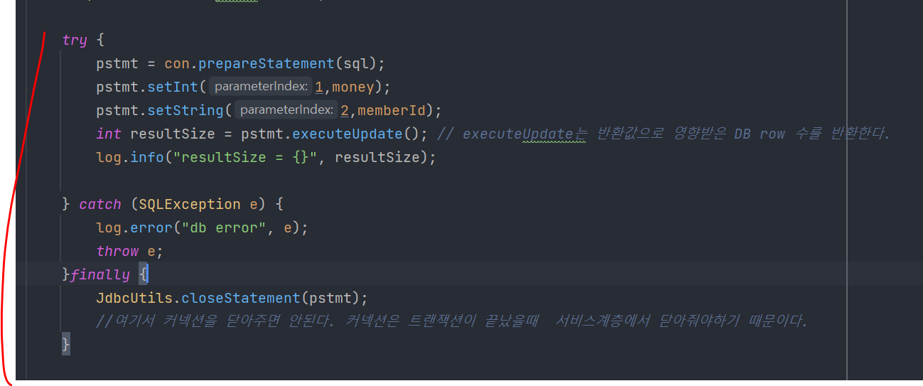 memberRepository.update(con,fromId, fromMember.getMoney() - money); // from의 돈을 깎고