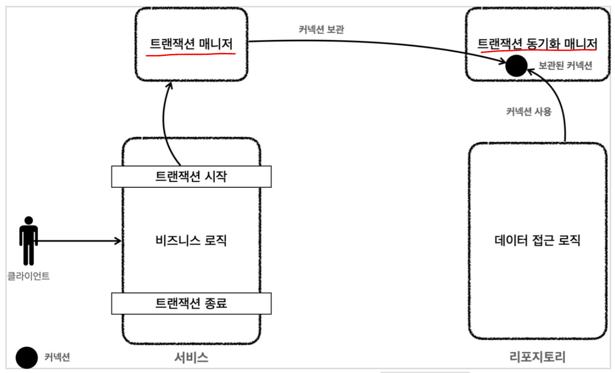(그래서 따로 트랜잭션을 시작하는 메소드가 필요없다. 이전에는 con.setAutoCommit(false); 를 이용해서 트랜잭션의 시작을 알렸다)