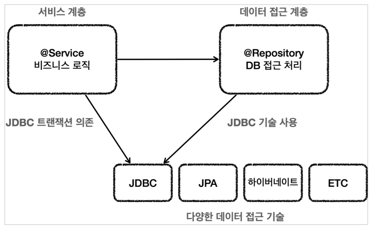 그래서 JDBC, JPA와 같은 구체적인 데이터 접근 기술로부터 서비스 계층을 보호해준다.