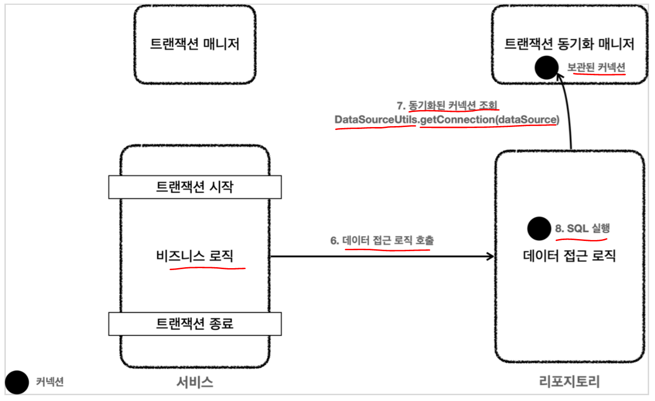 5. 비즈니스로직은 리포지토리의 메소드를 사용하게 될것이다. 리포지토리(데이터접근로직)에서 트랜잭션 동기화 매니저를 통해 동기화된 커넥션을 가져와서 SQL처리 업무를 수행한다.