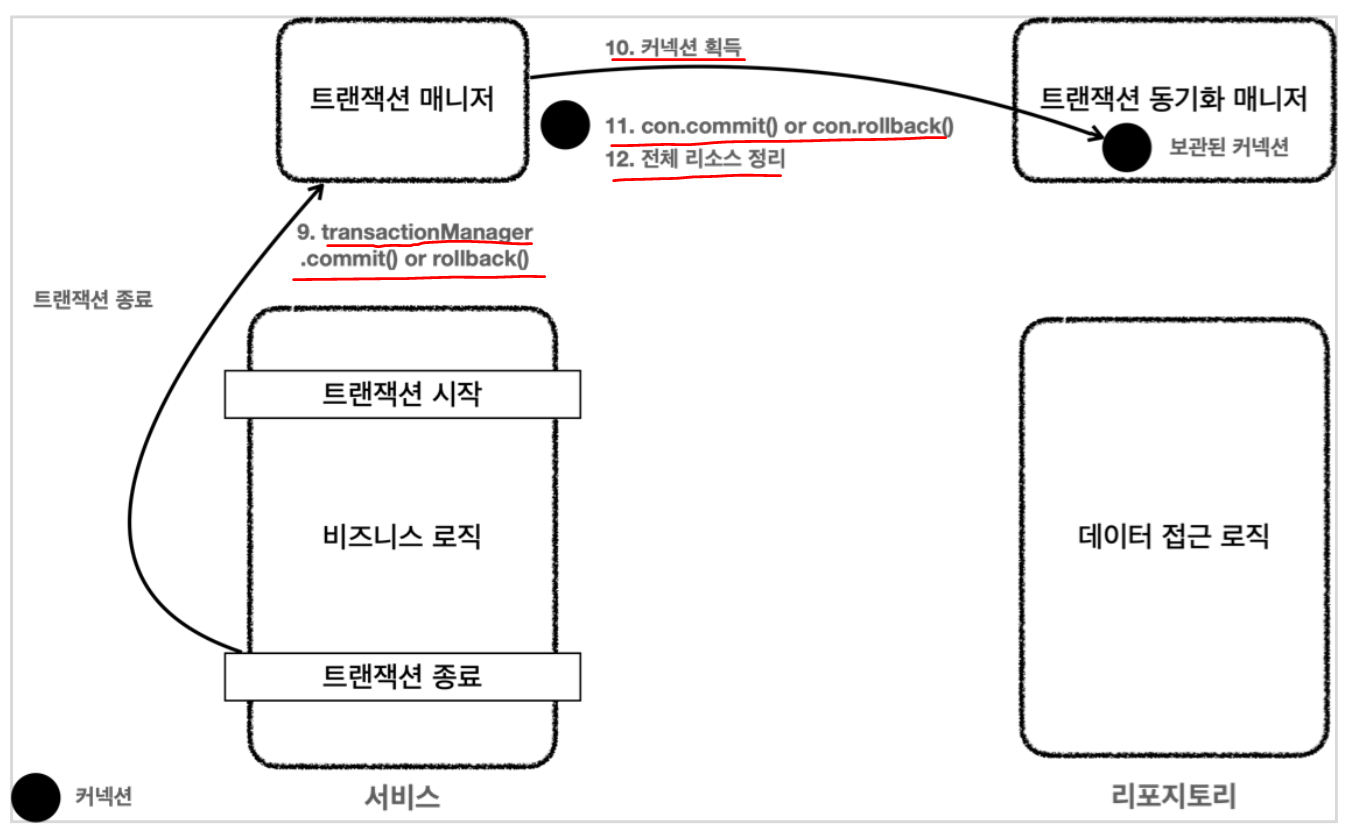 } // 사용한 커넥션에 대한 release는 트랜잭션 매니저가 commit 또는 rollback할때 알아서 해준다. (release하는 코드가 포함되어있음)