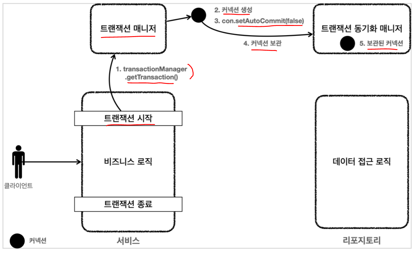 1. 서비스 계층에서 transactionManager.getTransaction() 을 호출해서 트랜잭션을 시작한다.