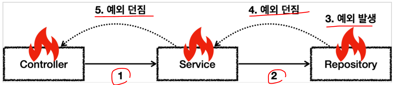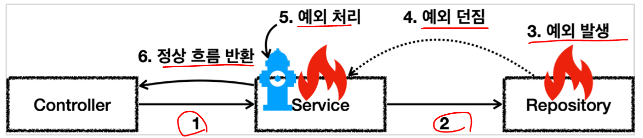 1. test --> service.callThrow() --> repository.call() [예외 발생, 던짐]