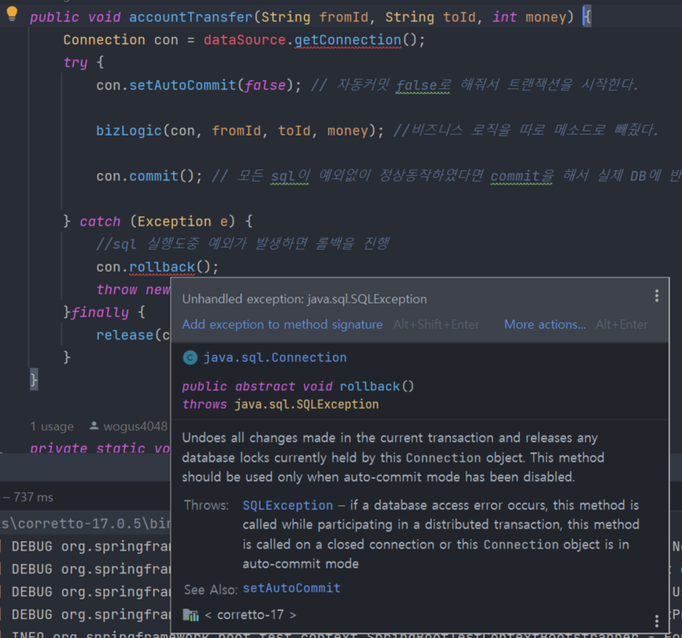 (컴파일러가 체크한다는것은 Connection.rollback()과 같은 메소드를 사용할때 exception처리를 하지않는다면 인텔리제이가 빨간줄을 그어서 처리하라고 알려주는 그런것들)