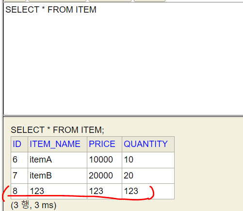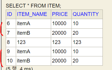 (참고로 서버를 다시 시작할 때 마다 TestDataInit 이 실행되기 때문에 itemA , itemB 도 데이터베이스에 계속 추가된다. 메모리와 다르게 서버가 내려가도 데이터베이스는 유지되기 때문이다.)