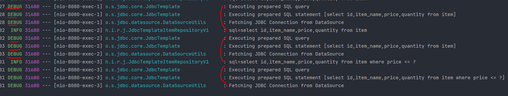 JdbcTemplate이 실행하는 SQL 로그를 확인하려면 application.properties 에 다음을 추가하면 된다.