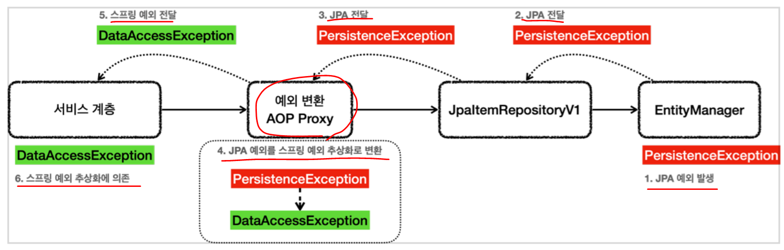 예외 변환 AOP 프록시는 JPA 관련 예외가 발생하면 JPA 예외 변환기를 통해